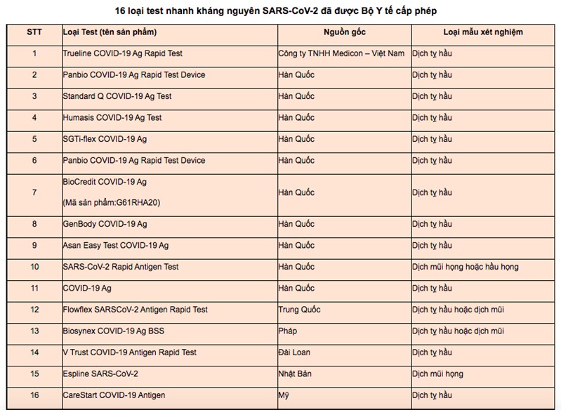 16 loại test nhanh kháng nguyên SARS-CoV-2 được Bộ Y tế cấp phép. Nguồn: Sở Y tế Hà Nội ngày 28/12.