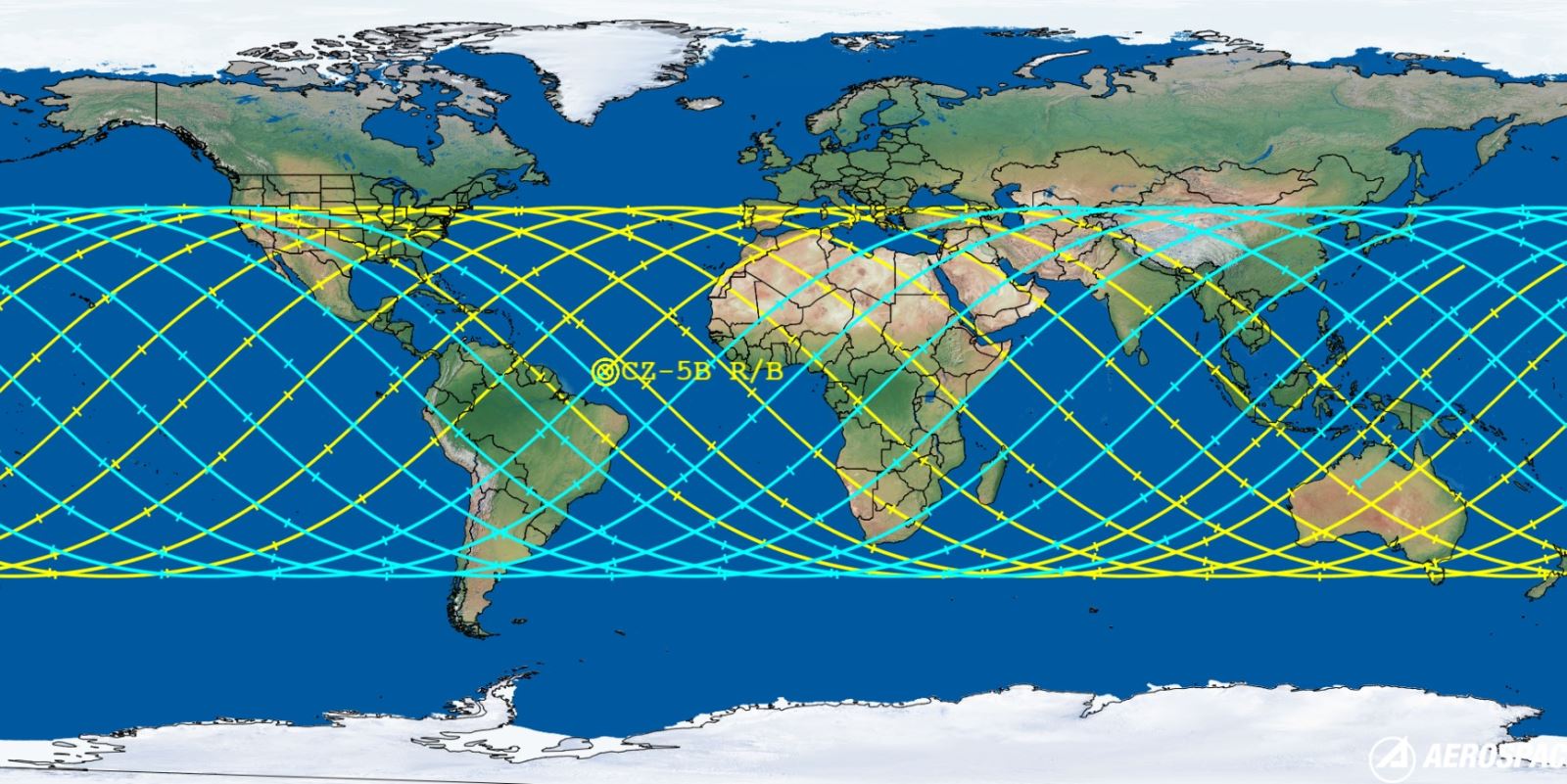 Đường rơi dự kiến của mảnh vỡ tên lửa Trường Chinh-5B. Các vị trí tên lửa tái nhập có thể ở bất kỳ đâu giữa đường màu xanh và màu vàng. Ảnh: Aerospace Corporation