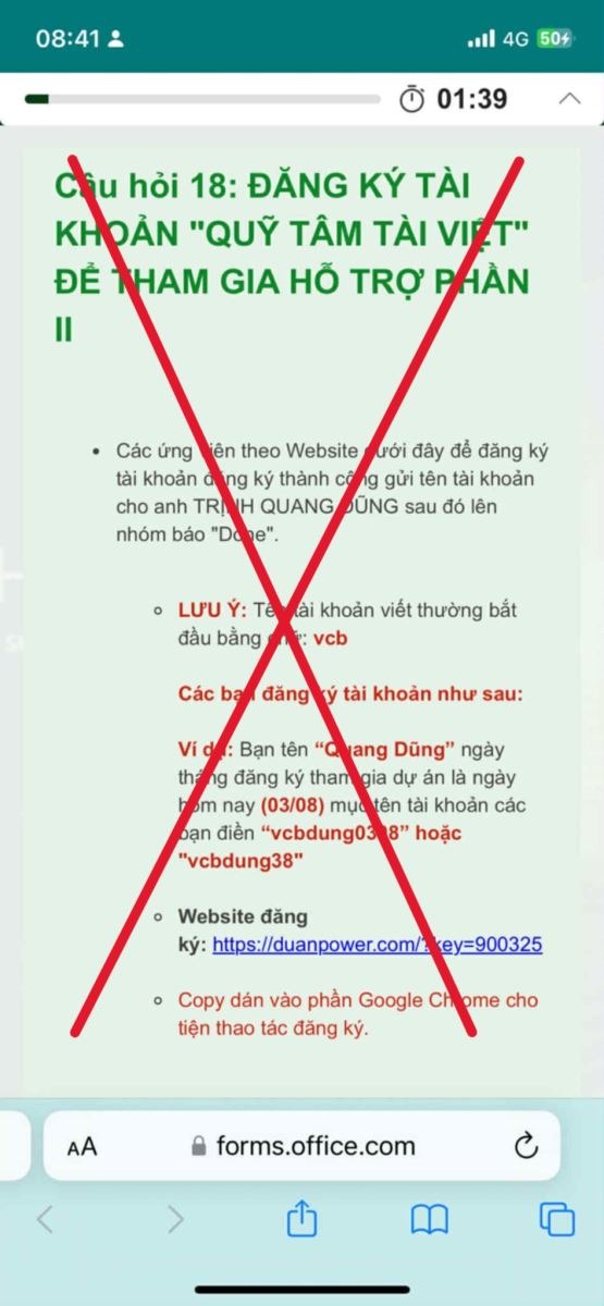 Để tạo lòng tin, đối tượng sử dụng các văn bản giả mạo con dấu, chữ ký của lãnh đạo Vietcombank, đồng thời xây dựng quy trình tuyển dụng phức tạp nhằm tạo lòng tin từ phía ứng viên bị hại. Sau khi ứng viên cung cấp thông tin cá nhân, đối tượng sẽ hướng dẫn ứng viên truy cập vào các website giả mạo (ví dụ như duanpower.com...) để đăng ký tài khoản và thực hiện "nhiệm vụ".