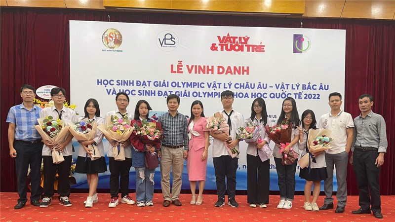 Đoàn giáo viên và học sinh Trường THPT Chuyên Hạ Long trong Lễ Vinh danh học sinh đoạt giải Olympic Vật lý châu Âu - Vật lý Bắc Âu và Olympic Hóa học quốc tế 2022. (Ảnh nhà trường cung cấp)