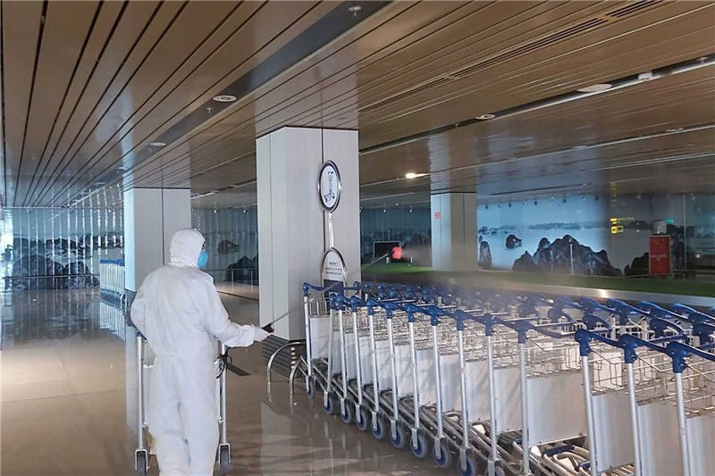 Phun dung dịch sát khuẩn tại sân bay Vân Đồn. Ảnh Đỗ Phương