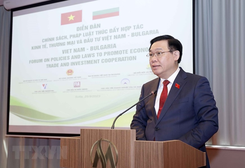 Chủ tịch Quốc hội Vương Đình Huệ phát biểu tại Diễn đàn Chính sách, pháp luật thúc đẩy hợp tác kinh tế, Thương mại, Đầu tư Việt Nam-Bulgaria. (Ảnh: Doãn Tấn/TTXVN).
