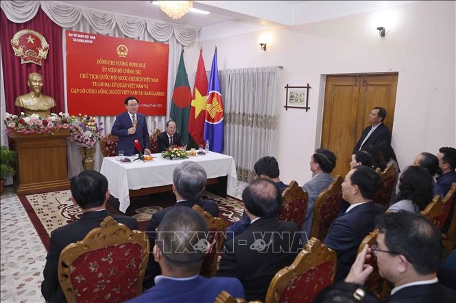 Chủ tịch Quốc hội Vương Đình Huệ gặp gỡ cán bộ Đại sứ quán, cộng đồng người Việt Nam tại Bangladesh. Ảnh: Doãn Tấn/TTXVN.