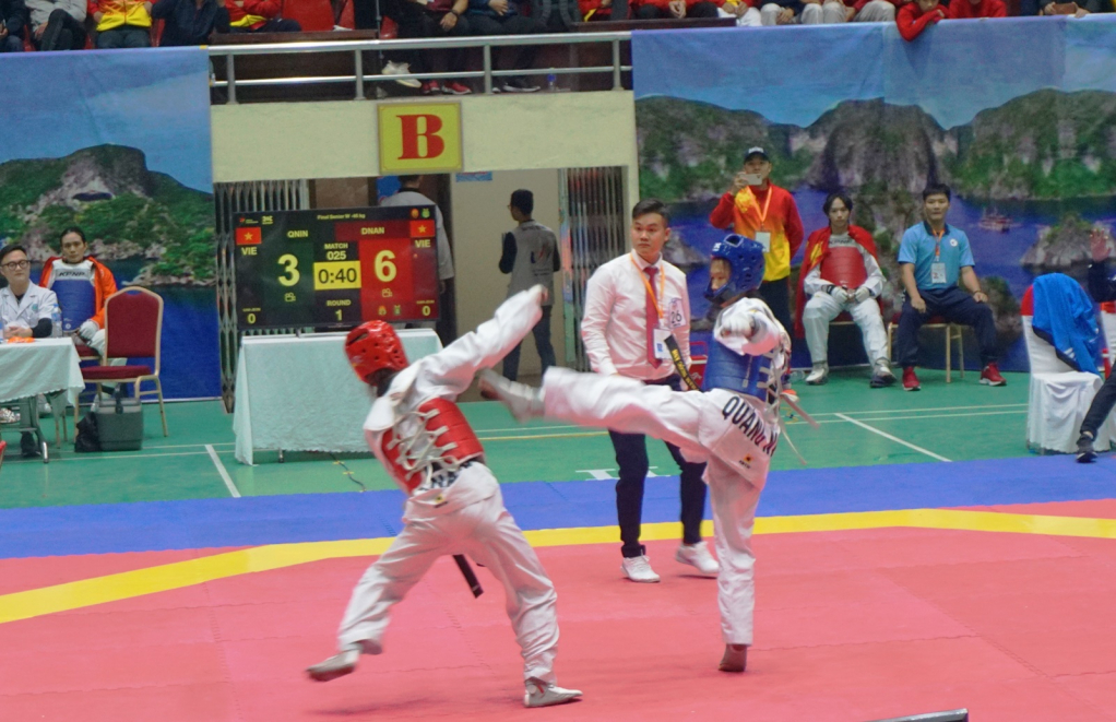 VĐV trẻ Nguyễn Hữu Thế Vinh, đội Quảng Ninh (giáp đỏ) có ngày thi đấu rất xuất sắc và mang về Huy chương Vàng lịch sử cho đoàn Taekwondo Quảng Ninh.