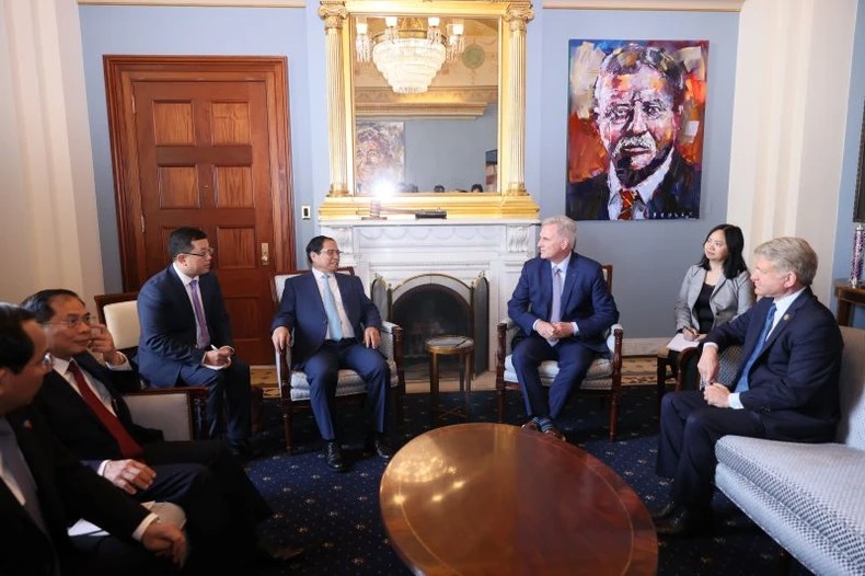 Chủ tịch Hạ viện Hoa Kỳ Kevin McCarthy và Chủ tịch Ủy ban Đối ngoại Hạ viện Michael McCaul bày tỏ vui mừng được đón Thủ tướng Chính phủ Phạm Minh Chính thăm trụ sở Hạ viện Hoa Kỳ; đánh giá cao về kết quả chuyến thăm Việt Nam của Tổng thống Biden và bày tỏ vui mừng khi hai nước xác lập khuôn khổ quan hệ mới.