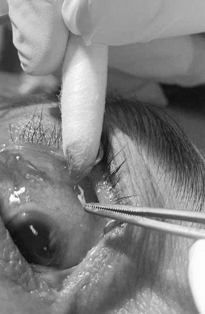 Người bệnh được chỉ định làm thủ thuật lấy dị vật dưới kết mạc. Quá trình can thiệp ghi nhận có một con giun dài khoảng 4cm, đã chết, nằm dưới lớp kết mạc nhãn cầu tại vị trí viêm thượng củng mạc.