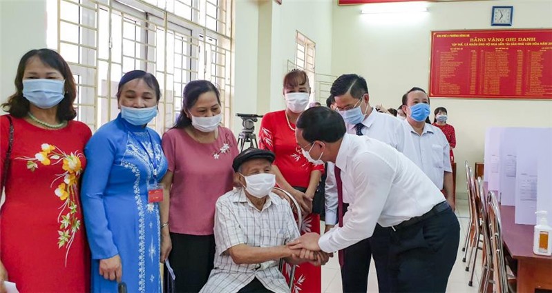 Đồng chí Nguyễn Xuân Ký, Ủy viên Trung ương Đảng, Bí thư Tỉnh ủy, Chủ tịch HĐND tỉnh, trò chuyện với cử tri 105 tuổi Nguyễn Văn Nhẫn tại khu vực bỏ phiếu số 6, phường Hồng Hà (TP Hạ Long).