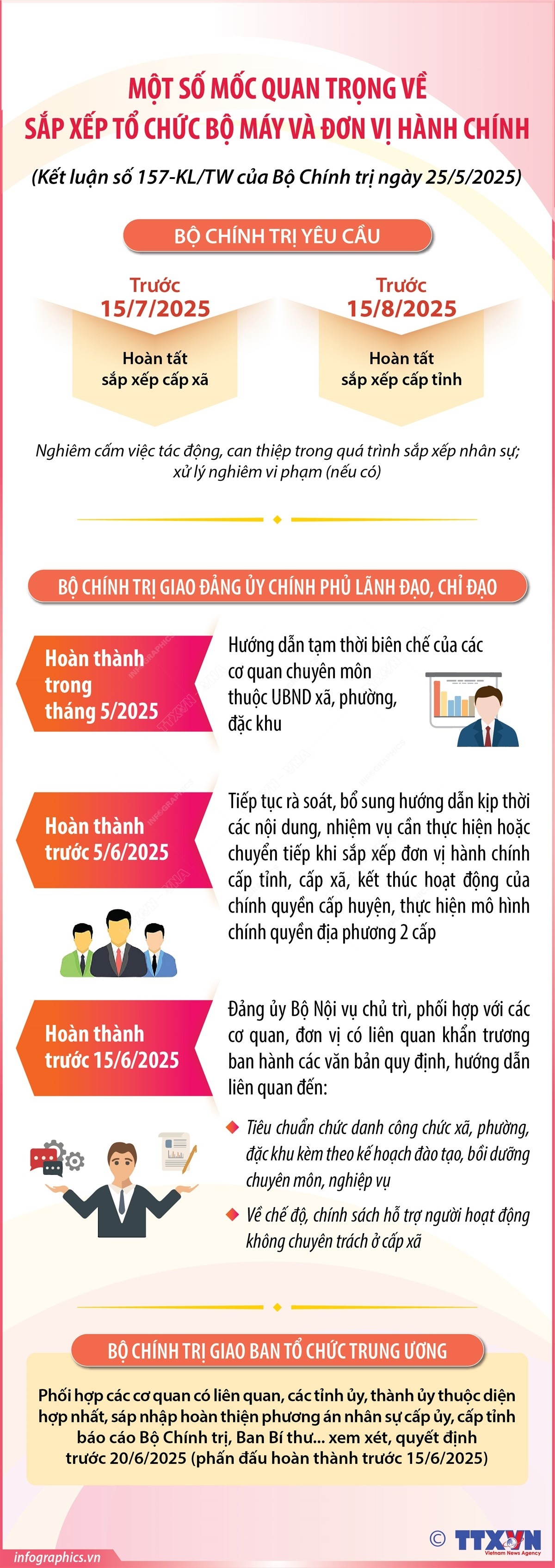Theo đó, Bộ Chính trị yêu cầu đưa vào hoạt động cấp xã mới từ ngày 1/7/2025, phấn đấu hoàn thành trước ngày 15/7/2025. Cấp tỉnh phấn đấu hoàn thành trước ngày 15/8/2025. Nghiêm cấm việc tác động, can thiệp trong quá trình sắp xếp nhân sự; xử lý nghiêm vi phạm (nếu có).