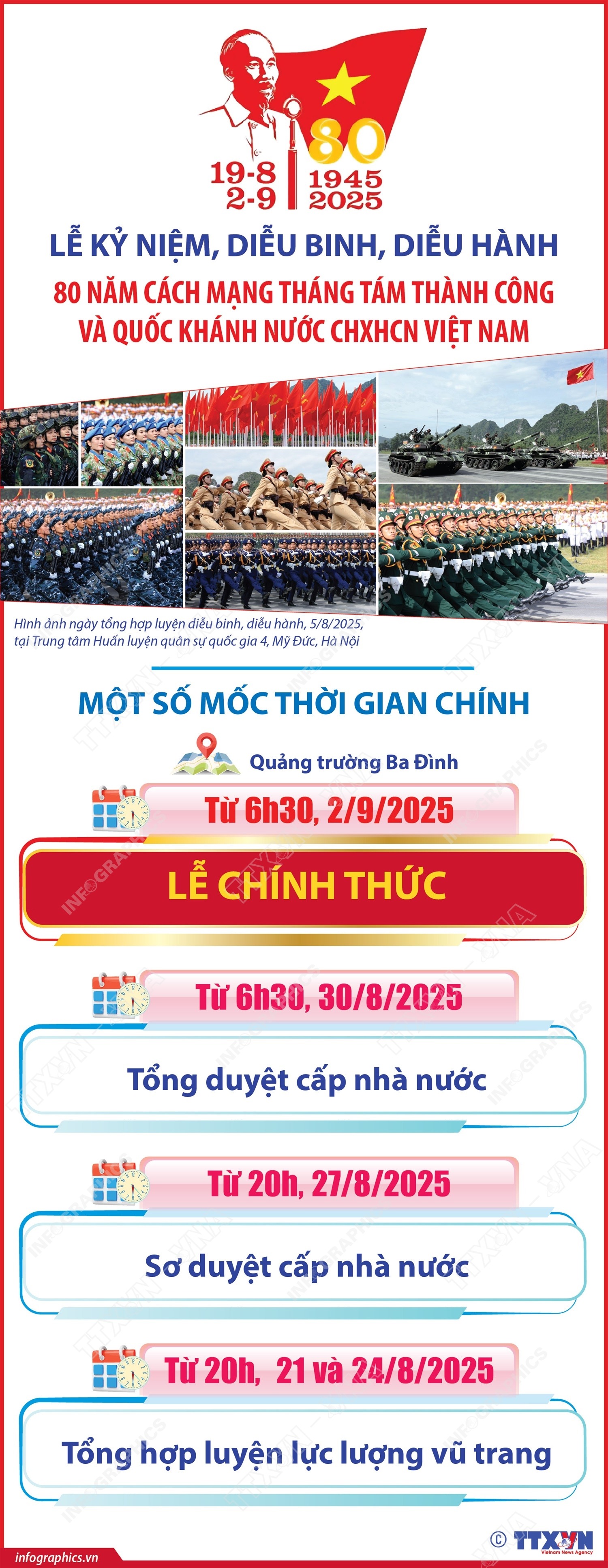 Thông tin tại buổi Họp báo Chính phủ thường kỳ, chiều 7/8/2025, Thiếu tướng Tống Văn Thanh, Phó Cục trưởng Cục Tuyên huấn, Tổng cục Chính trị Quân đội Nhân dân Việt Nam cho biết, việc tổ chức diễu binh diễu hành trong Lễ kỷ niệm 80 năm Quốc khánh 2/9/2025 đã được Trung ương giao cho Bộ Quốc phòng chủ trì, phối hợp với Bộ Công an, Bộ Văn hóa, Thể thao và Du lịch, thành phố Hà Nội và các ban, bộ, ngành, cơ quan, đơn vị liên quan, sẽ thực hiện tại Quảng trường Ba Đình vào sáng mùng 2/9/2025. Về một số mốc thời gian chính, Thiếu tướng Tống Văn Thanh cho biết: Tổng hợp luyện lực lượng vũ trang diễn ra từ 20 giờ các ngày 21 và ngày 24/8/2025. Sơ duyệt cấp nhà nước từ 20 giờ ngày 27/8/2025. Tổng duyệt cấp nhà nước từ 6 giờ 30 ngày 30/8/2025. Lễ chính thức là 6 giờ 30 ngày mùng 2/9/2025 và địa điểm đều ở tại Quảng trường Ba Đình.