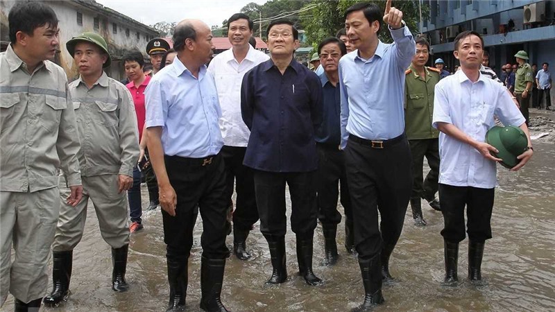 Chủ tịch nước Trương Tấn Sang kiểm tra tình hình khắc phục hậu quả do đợt mưa lũ gây ra tại Công ty than Mông Dương và tỉnh Quảng Ninh, tháng 8/2015. (Ảnh: TTXVN)