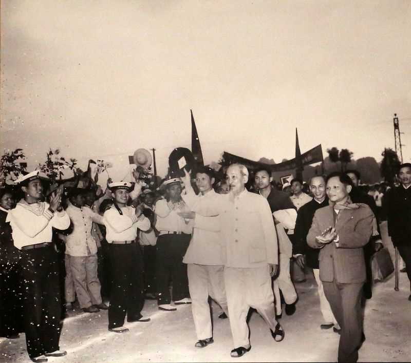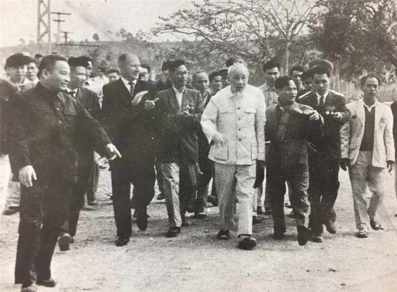 Chủ tịch Hồ Chí Minh thăm, chúc Tết nhân dân Uông Bí, công nhân công trường xây dựng Nhà máy Điện Uông Bí, xuân Ất Tỵ (1965). (Ảnh: baoquangninh.vn)