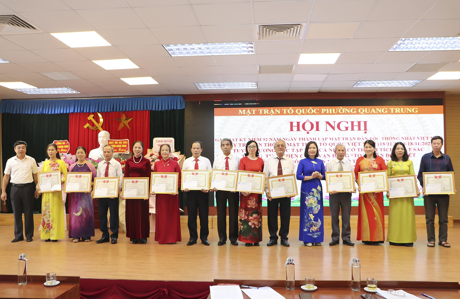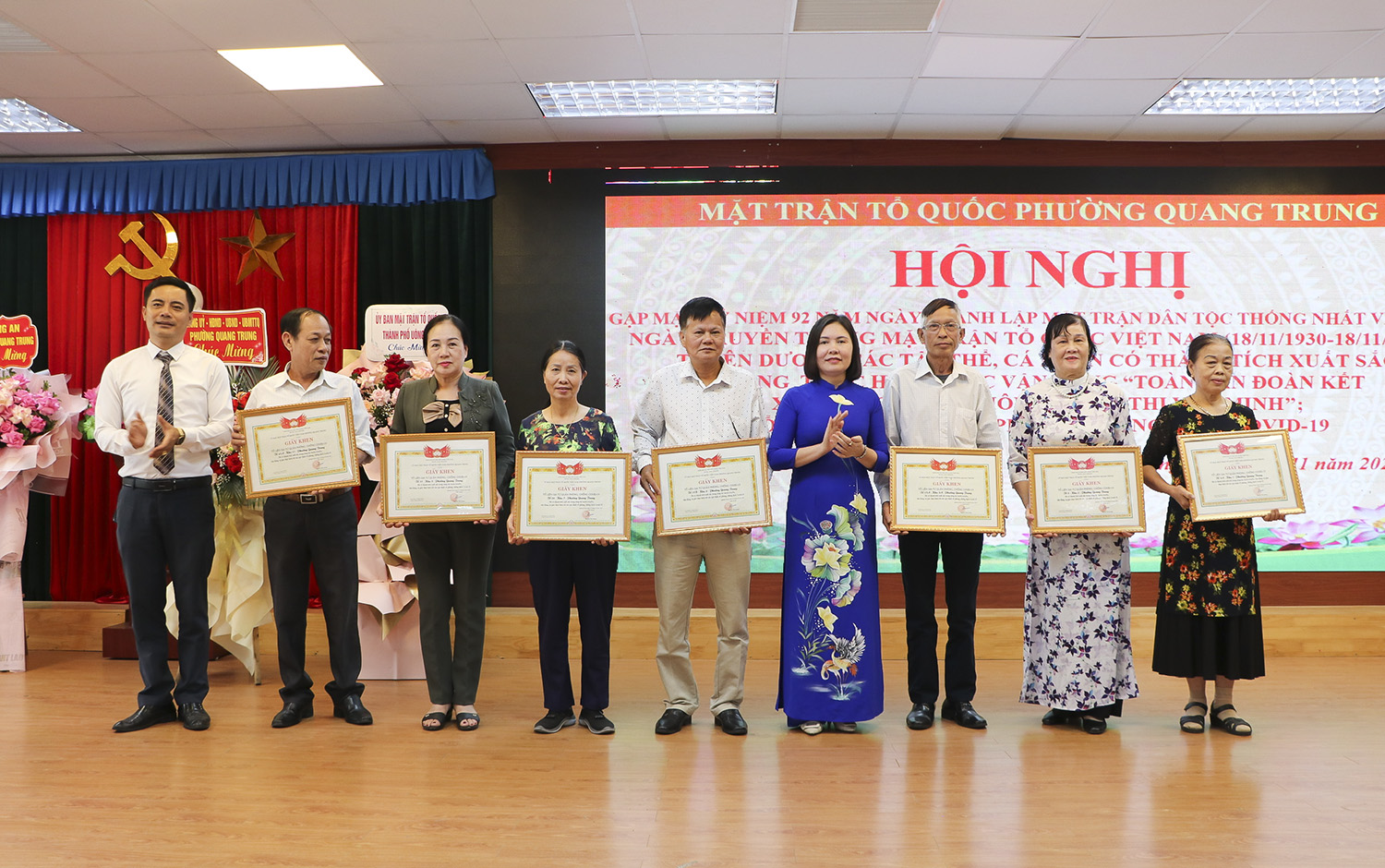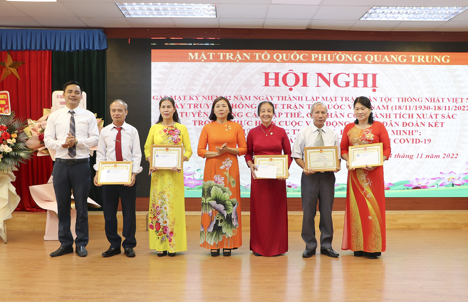 Nhân dịp này, UBND phường Quang Trung đã khen thưởng 20 tập thể, 5 cá nhân có thành tích xuất sắc trong thực hiện cuộc vận động “Toàn dân đoàn kết xây dựng nông thôn mới, đô thị văn minh” và triển khai thực hiện mô hình “Tổ liên gia tự quản phòng chống Covid-19”.