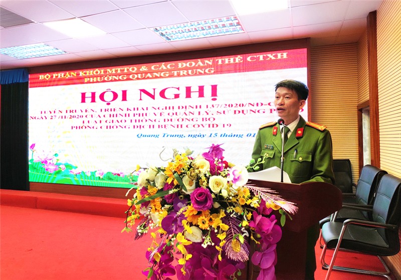 Lãnh đạo công an phường Quang Trung tuyên truyền Nghị định 137/2020/NĐ-CP tại hội nghị.