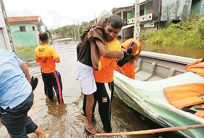 Lực lượng cứu hộ Xri Lan-ca đưa người dân ra khỏi vùng ngập lụt. Ảnh ROI-TƠ