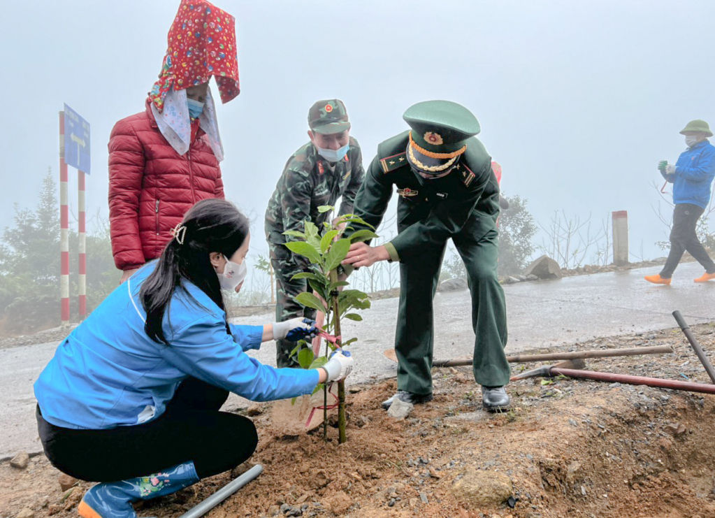 Chiến sĩ biên phòng cùng người dân tham gia "Tết trồng cây đời đời nhớ ơn Bác Hồ” xuân Nhâm Dần 2022 tại xã Quảng Đức, huyện Hải Hà.