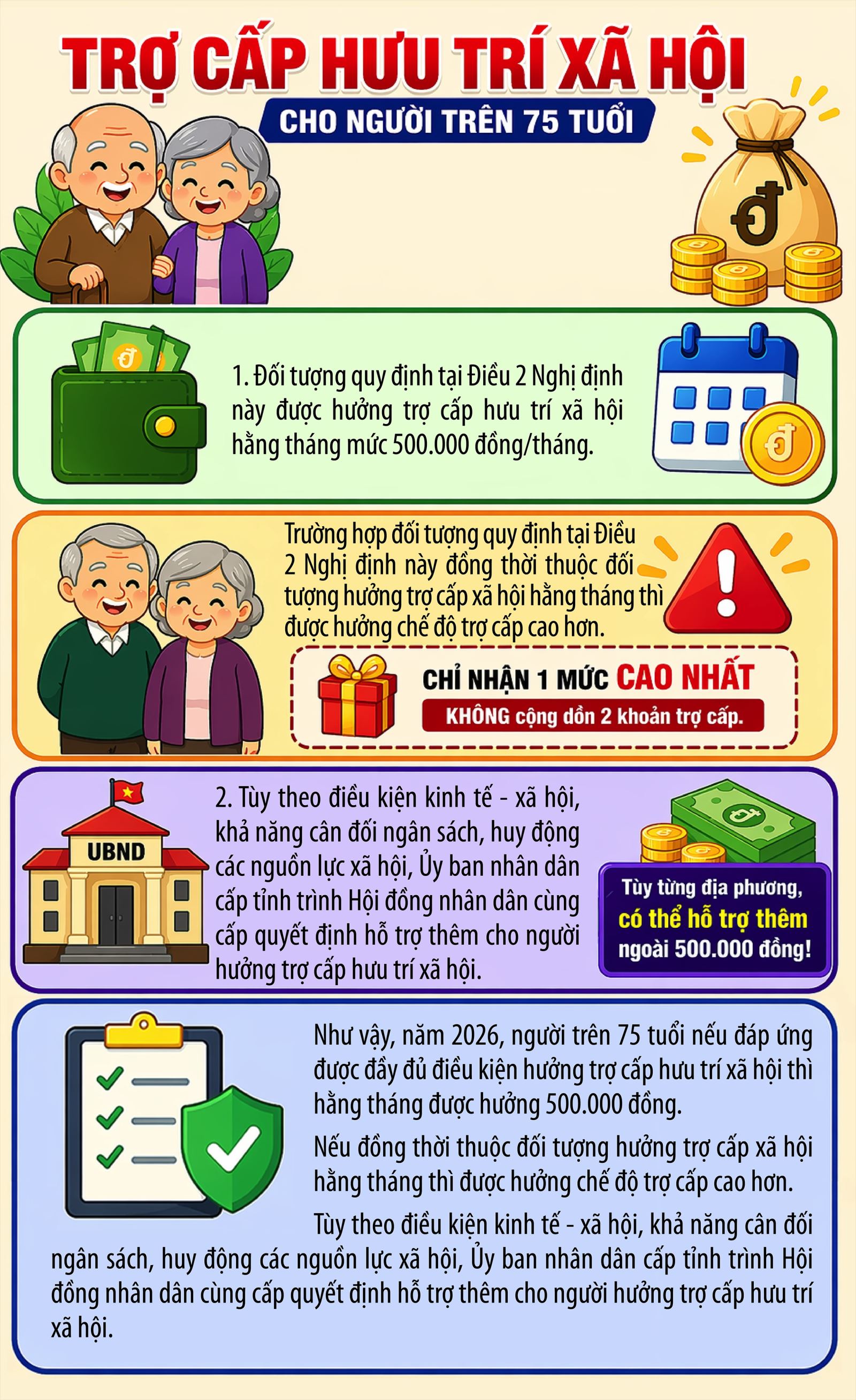 Mức hưởng trợ cấp hưu trí xã hội năm 2026 cho người trên 75 tuổi