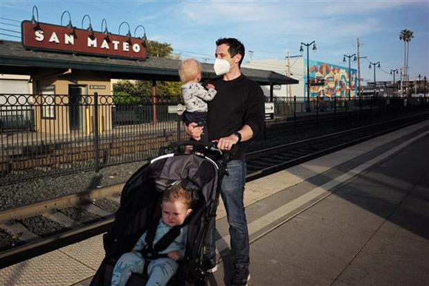 Người dân đeo khẩu trang phòng dịch COVID-19 tại ga tàu hỏa ở San Mateo, bang California (Mỹ) hồi năm ngoái. (Ảnh: THX/TTXVN)