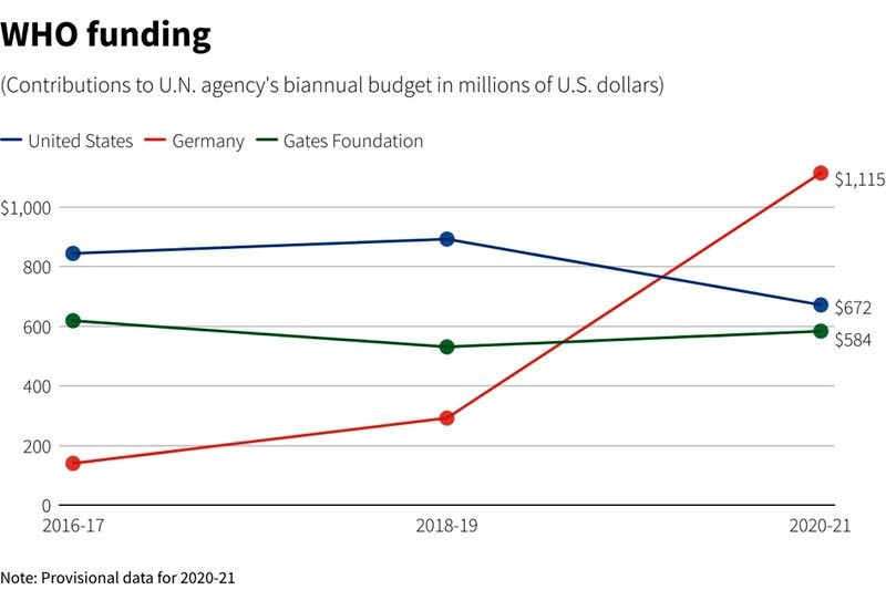 Dẫu vậy, WHO đã tìm được cách nâng các khoản đóng góp từ những nhà tài trợ khác, giúp tổng ngân sách thu được trong 2 năm qua vẫn tăng. Do việc giảm đóng góp, Mỹ đã bị Đức soán ngôi nhà tài trợ hàng đầu cho WHO khi Berlin góp hơn 1 tỷ USD trong thời gian đại dịch.