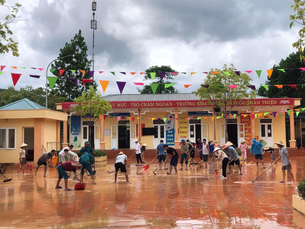 Cán bộ, giáo viên Trường TH-THCS Kỳ Thượng (xã Kỳ Thượng, TP Hạ Long) dọn sân trường sau cơn bão Maon, tháng 8/2022.