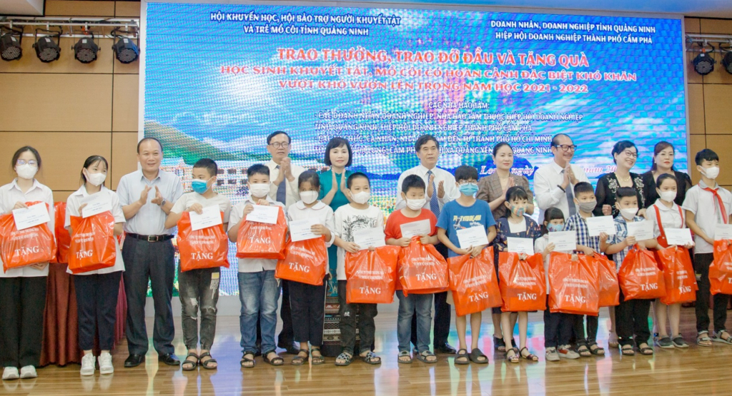 Lãnh đạo các sở, ban, ngành của tỉnh, cùng nhà hảo tâm trao thưởng đỡ đầu và tặng quà cho học sinh khuyết tật, mồ côi có hoàn cảnh đặc biệt khó khăn vượt khó vươn lên trong năm học 2021-2022.