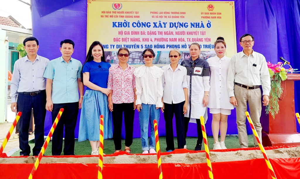 Bà Vũ Hoàng Yến (thứ 3 trái sang) Giám đốc Công ty CP Du thuyền 5 sao Hồng Phong hỗ trợ xây nhà ở cho gia đình em Đặng Thị Hồng Thắng (khu 4, phường Nam Hòa, TX Quảng Yên).