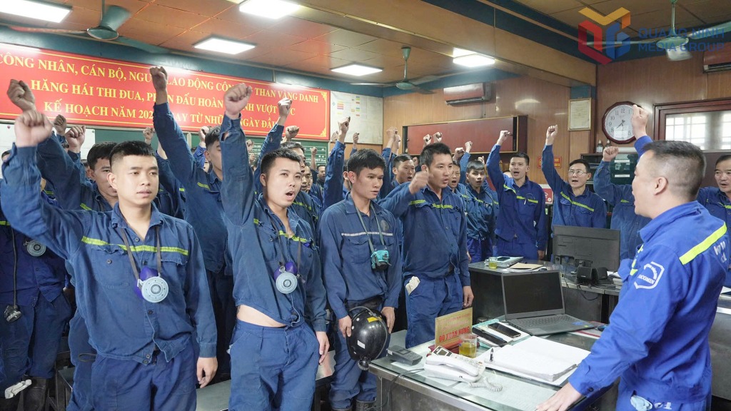 Cán bộ, công nhân Công ty CP Than Vàng Danh - Vinacomin hô khẩu hiệu quyết tâm trước khi vào ca sản xuất.
