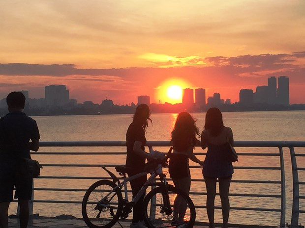 Các bạn trẻ ngắm hoàng hôn bên Hồ Tây (Hà Nội), lúc nhiệt độ trong ngày dịu dần. (Ảnh: Ngọc Duy)