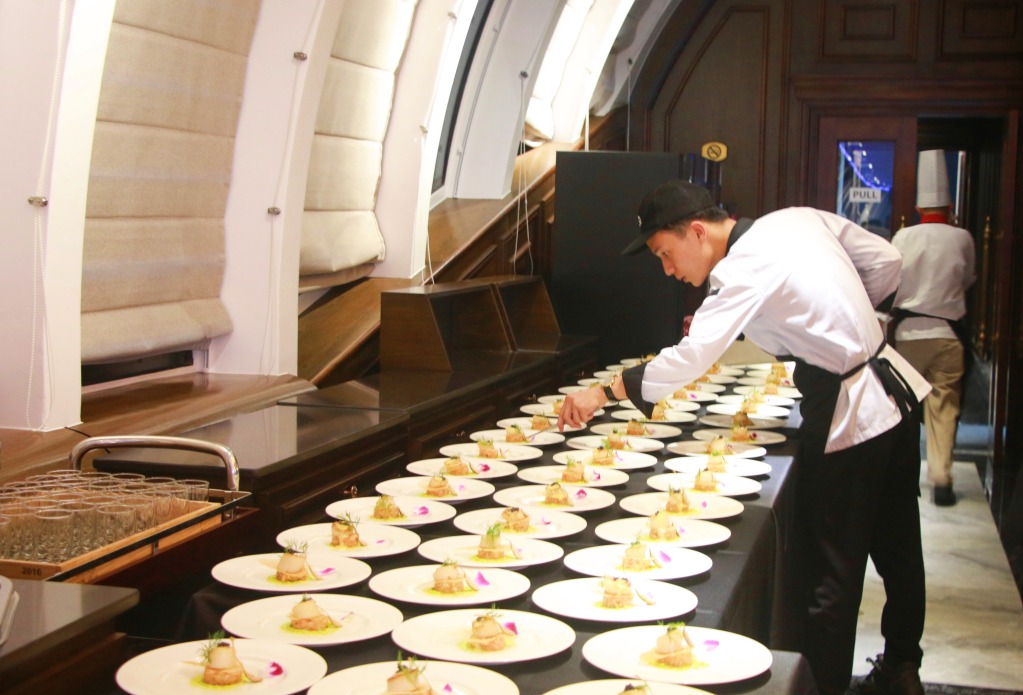 Nhân viên bếp của Du thuyền nhà hàng 5 sao Paradise Delight chuẩn bị đồ ăn phục vụ du khách.