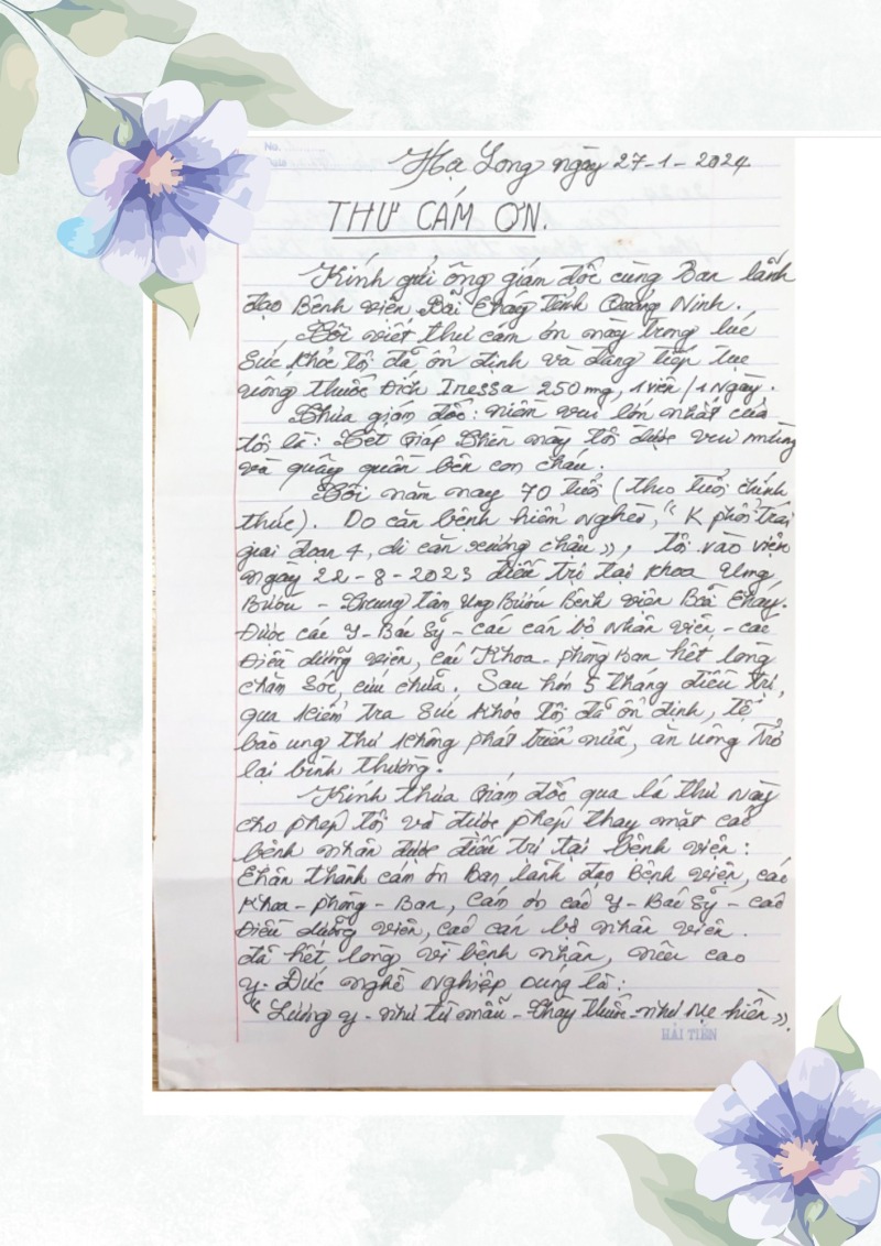Những ngày giáp Tết Nguyên đán 2024 sau khi ổn định sức khỏe, được trở về đoàn tụ với gia đình, ông Nguyễn Văn Sơn (70 tuổi), trú tại tổ 3, khu An Sơn, phường Cẩm Sơn, TP Cẩm Phả, đã xúc động viết: "Tôi vào viện từ ngày 22/8/2023, điều trị tại Khoa Ung bướu và được các bác sĩ, điều dưỡng hết lòng chăm sóc, cứu chữa. Sau 5 tháng điều trị, qua kiểm tra sức khỏe tôi đã ổn định, tế bào ung thư không phát triển và ăn uống bình thường. Tôi xin gửi lời cảm ơn chân thành Ban lãnh đạo Bệnh viện, các khoa, phòng, các y bác sĩ, điều dưỡng viên Bệnh viện Bãi Cháy đã hết lòng vì bệnh nhân, nêu cao y đức nghề nghiệp “Lương y như từ mẫu...".