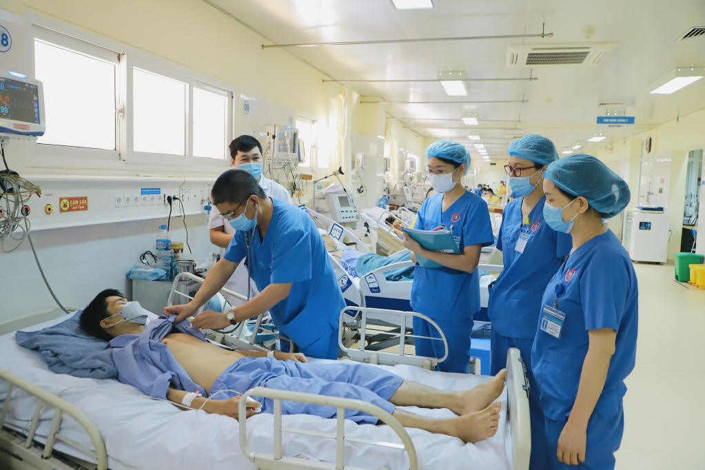 Bác sĩ CKI Hoàng Thăng Vân, Trưởng khoa Hồi sức tích cực nội (Bệnh viện Việt Nam - Thụy Điển Uông Bí) thăm khám cho bệnh nhân bị nhiễm khuẩn huyết được điều trị thành công tại bệnh viện. Ảnh: Hoài Minh