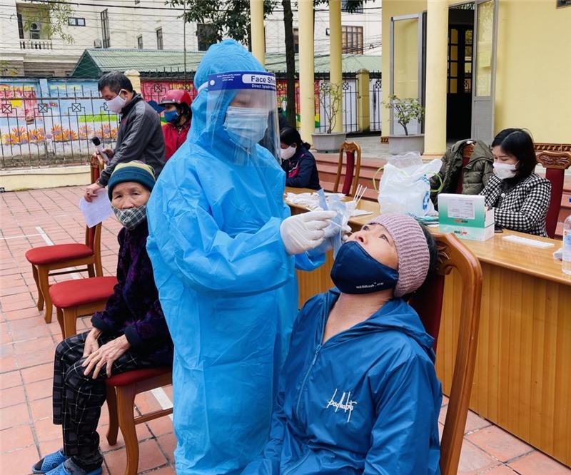Nhân viên y tế tại Uông Bí lấy mẫu xét nghiệm Covid-19 cho người dân.