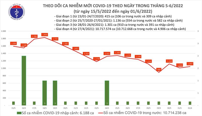 - Tính từ 16h ngày 31/5 đến 16h ngày 01/6, trên Hệ thống Quốc gia quản lý ca bệnh COVID-19 ghi nhận 1.047 ca nhiễm mới đều ở trong nước (tăng 37 ca so với ngày trước đó) tại 40 tỉnh, thành phố (có 871 ca trong cộng đồng).