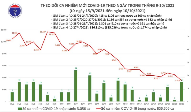 Bản tin dịch COVID-19 của Bộ Y tế ngày 10/10 cho biết có 3.528 ca mắc COVID-19 tại 41 tỉnh, thành phố, riêng TP HCM có 1.067 ca. Đây là số ca mắc thấp nhất trong khoảng 2 tháng qua. Trong ngày có 21.398 bệnh nhân khỏi, cao gấp 6 lần số mắc.