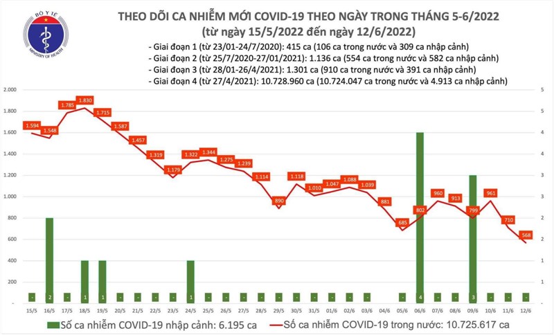 Bản tin phòng chống dịch COVID-19 ngày 12/6 của Bộ Y tế cho biết có 568 ca mắc mới COVID-19, giảm 142 trường hợp so với hôm qua; Số F0 khỏi gấp gần 10 lần; trong ngày không có F0 tử vong.