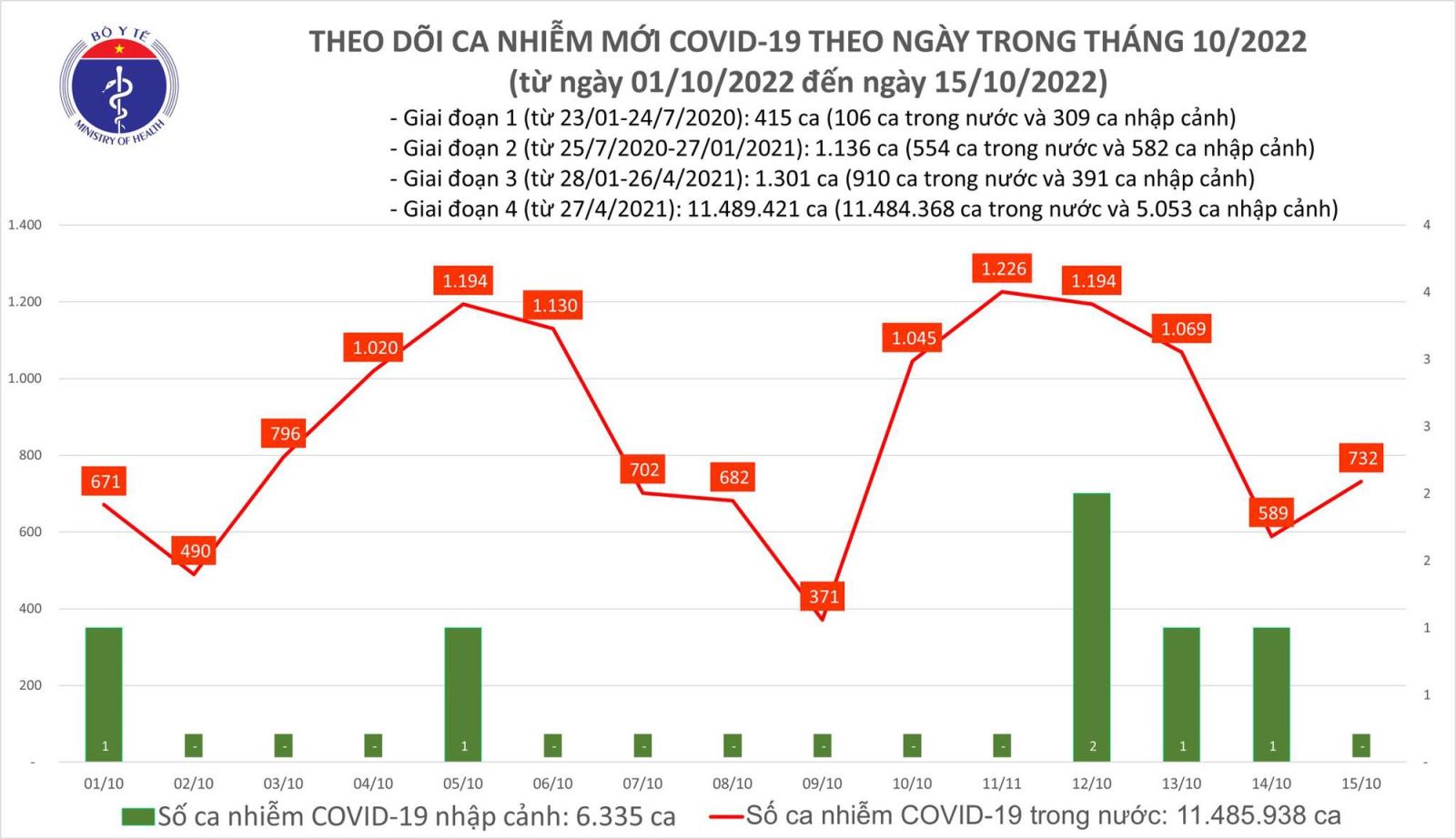 Bản tin phòng chống dịch COVID-19 ngày 15/10 của Bộ Y tế cho biết có 732 ca mắc mới, tăng gần 250 ca so với ngày trước đó; Trong ngày có gần 300 bệnh nhân ra viện, tiếp tục không có trường hợp tử vong.