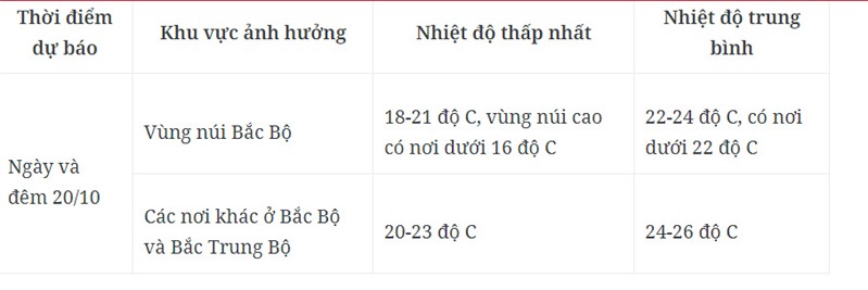 Do ảnh hưởng của không khí lạnh, từ ngày 20/10, khu vực Bắc Bộ và Bắc Trung Bộ trời lạnh về đêm và sáng, vùng núi đêm và sáng sớm trời rét. Trong đợt không khí lạnh này nhiệt độ thấp nhất ở các khu vực trên từ 19-22 độ C, riêng khu vực vùng núi Bắc Bộ 16-19 độ C, vùng núi cao có nơi dưới 15 độ C.