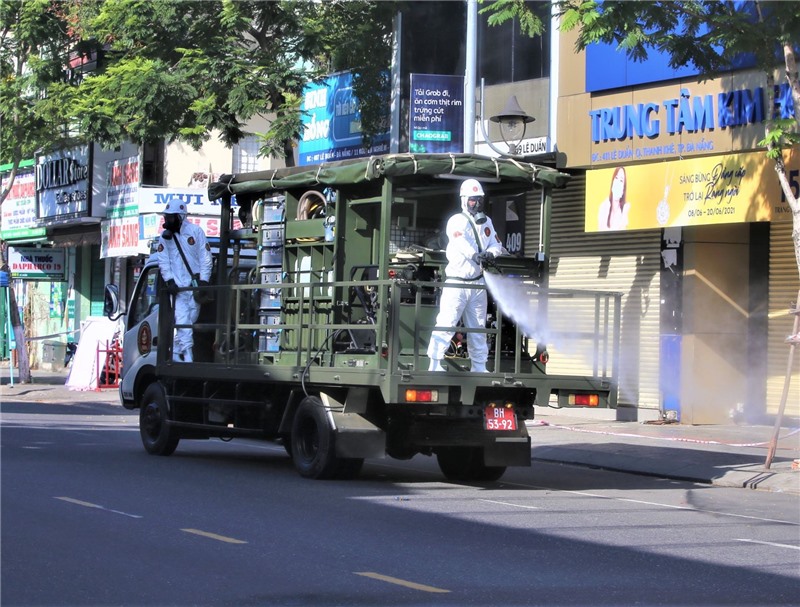 Lực lượng chức năng phun khử khuẩn khu vực có bệnh nhân dương tính với SARS-CoV-2 ở Đà Nẵng. Ảnh: VGP/Lưu Hương