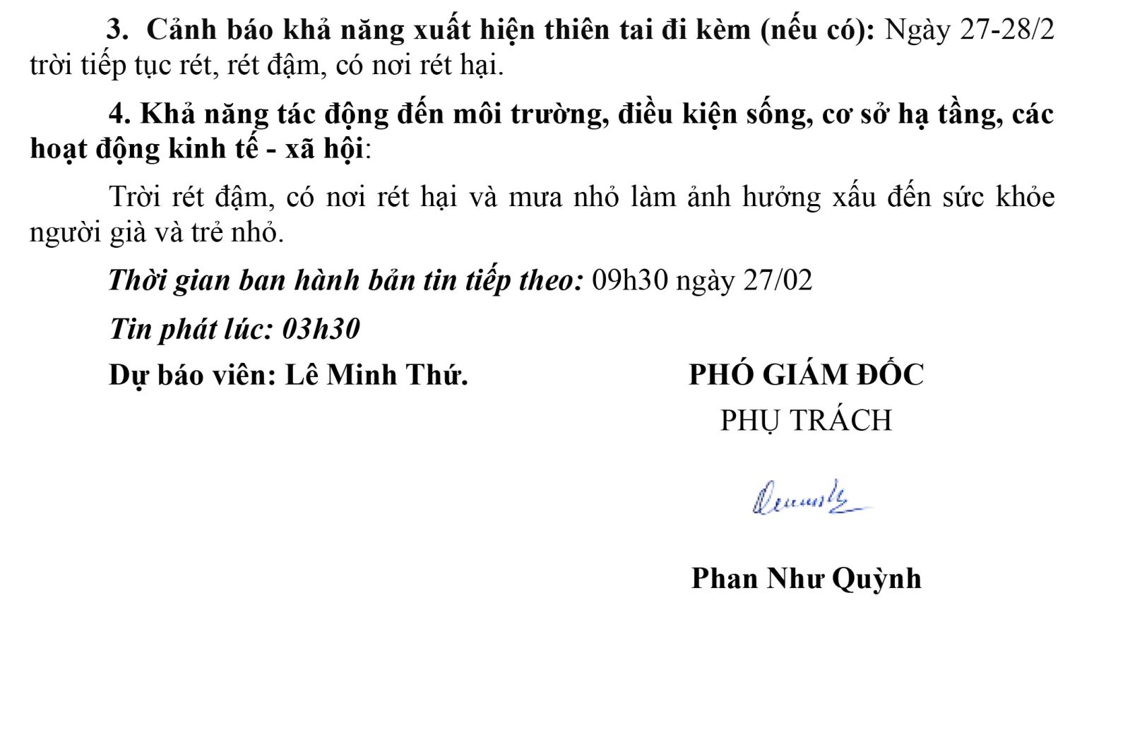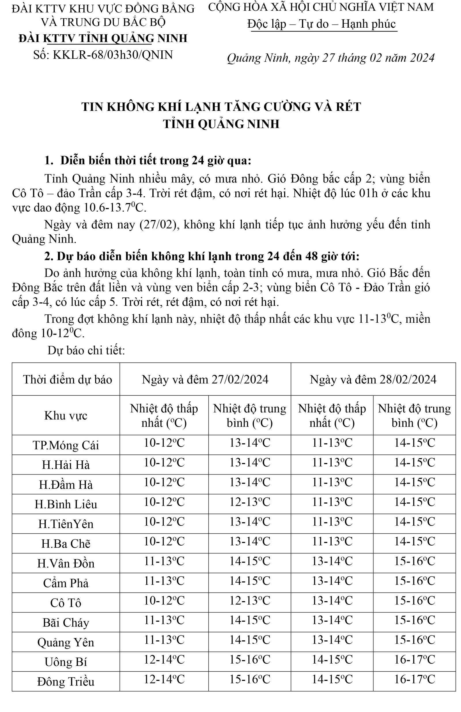 Ngày 27/02 tỉnh Quảng Ninh không khí lạnh tăng cường và rét