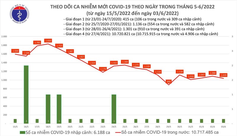 Bản tin phòng chống dịch COIVD-19 ngày 3/6 của Bộ Y tế cho biết có 1.039 ca COVID-19 mới tại 46 tỉnh, thành; số khỏi gấp 9 lần số mắc mới; Trong ngày không có F0 tử vong.