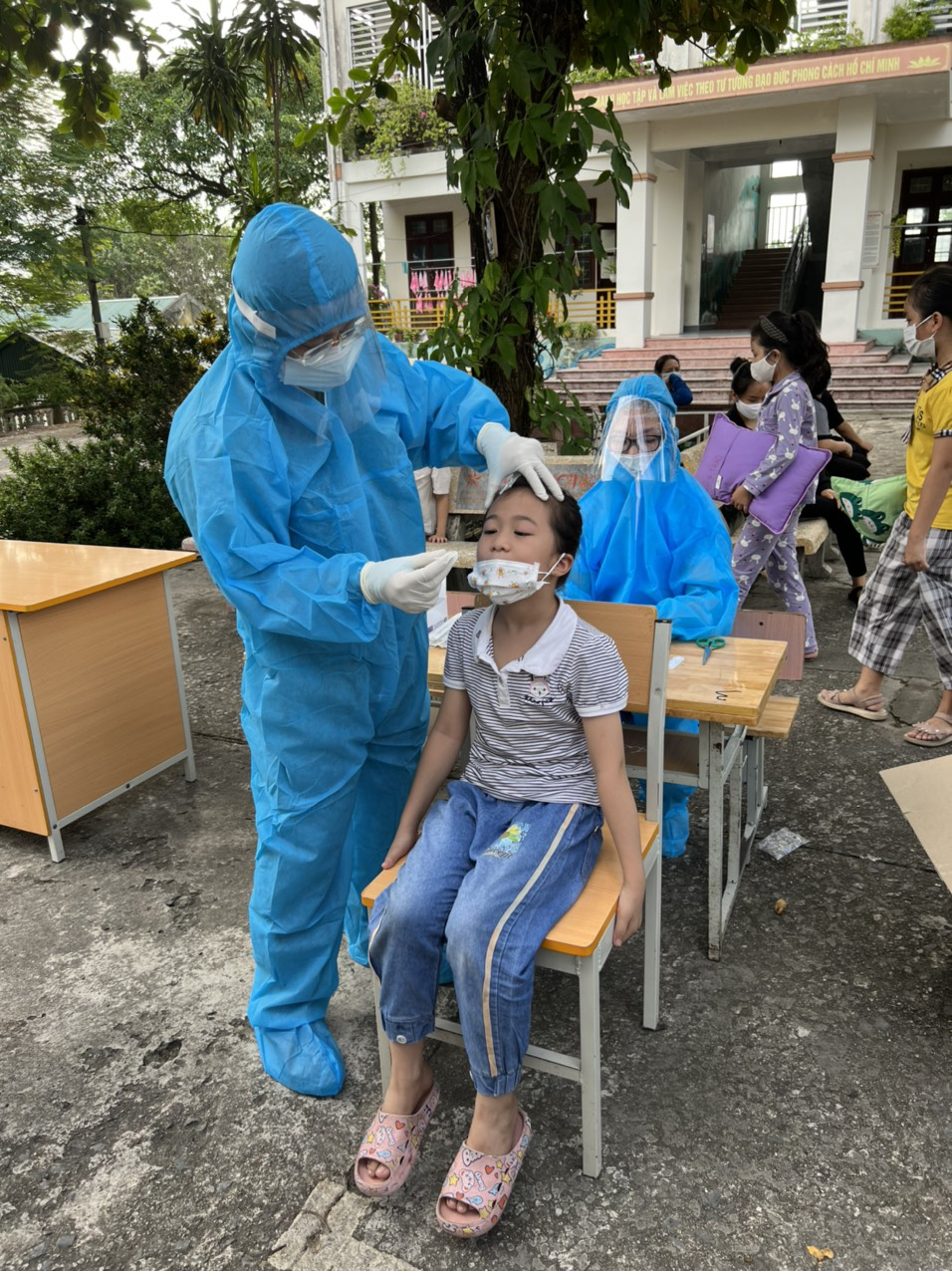 Nhân viên y tế Bệnh viện Phục hồi chức năng tỉnh tham gia hỗ trợ TX Đông Triều lấy mẫu xét nghiệm Covid-19 trong cộng đồng. (Ảnh do Bệnh viện cung cấp)