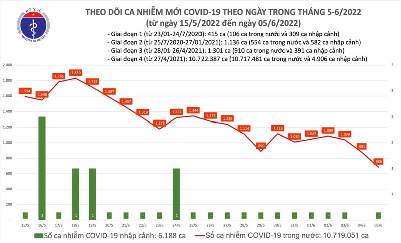 Bản tin phòng chống dịch COVID-19 ngày 5/6 của Bộ Y tế cho biết có 685 ca mắc mới COVID-19 tại 36 tỉnh, thành phố; số lượng thấp nhất trong gần 1 năm qua. Cả nước hiện chỉ còn 35 F0 nặng. Số ca khỏi gấp gần 14 lần số mắc mới.
