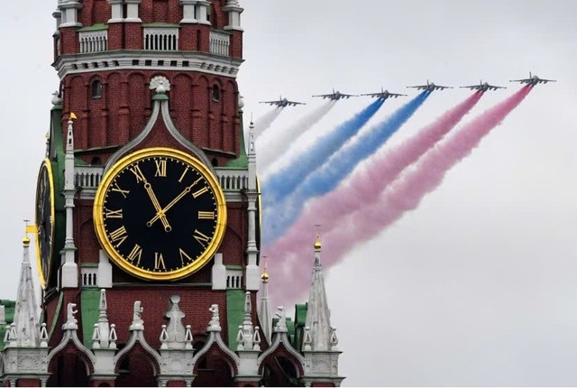 Máy bay tấn công Sukhoi Su-25 phun khói mang màu cờ Nga khi bay qua trung tâm Moscow, trong cuộc duyệt binh Ngày Chiến thắng, ngày 9/5/2021. (Nguồn Getty Images)