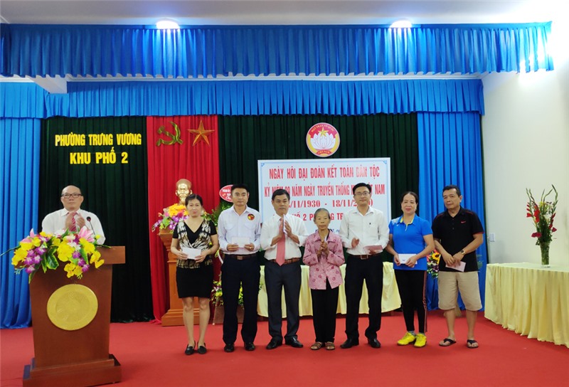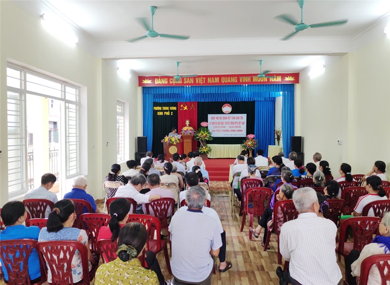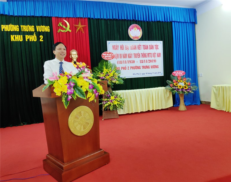 Ngày 18-11, khu 2, phường Trưng Vương tưng bừng tổ chức ngày hội đại đoàn kết toàn dân tộc, kỷ niệm 89 năm ngày truyền thống MTTQ Việt Nam. Đồng chí Nguyễn Chiến Thắng, UVBTV Thành ủy, Thủ trưởng Cơ quan Kiểm tra - Thanh tra thành phố dự, chúc mừng.