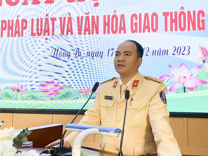 Đồng chí Thiếu tá Bùi Tuấn Anh - Cán bộ đội CSGT Công an Thành phố tuyên truyền các nội dung về ATGT.