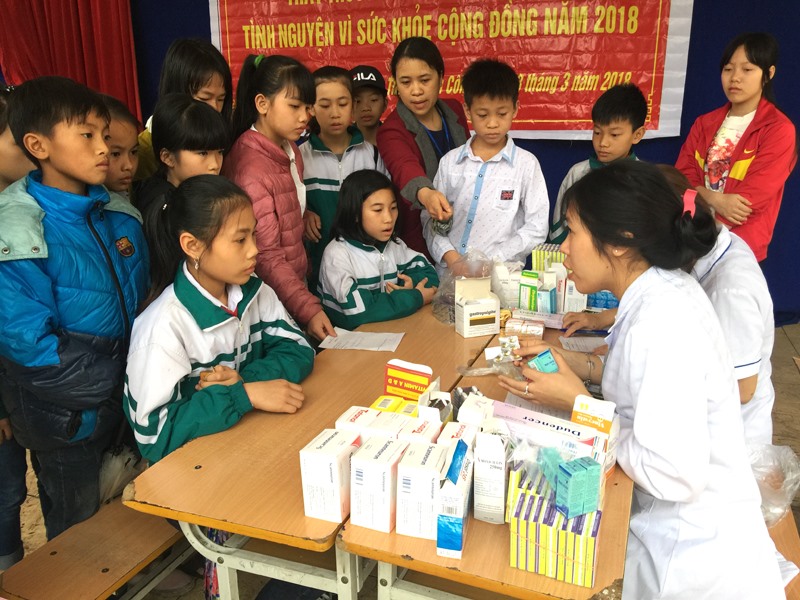 Bác sỹ tư vấn, phát thuốc cho các em học sinh.