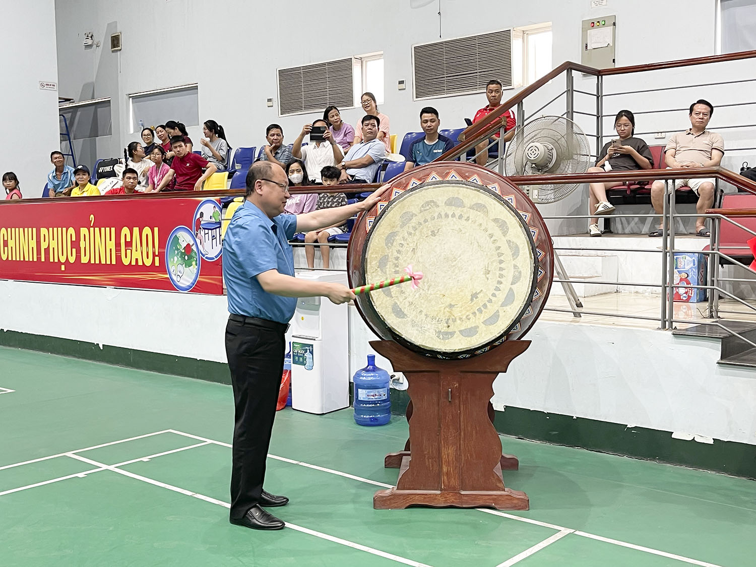 Đồng chí Bùi Minh Thanh, Phó Chủ tịch Thường trực Liên đoàn Lao động tỉnh, gióng trống khai mạc Ngày hội.