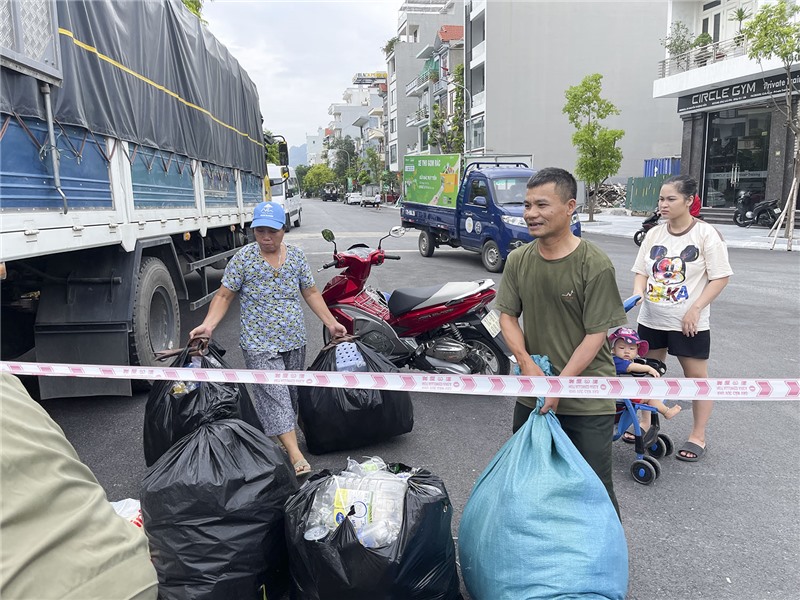 Trong ngày đầu triển khai, Công ty CP Xi măng và Xây dựng Quảng Ninh đặt điểm thu gom rác tái chế tại khu phố 4, phường Hồng Hà, thành phố Hạ Long. 7h30’, điểm thu gom mới mở cửa hoạt động nhưng từ 7h00 đã có khá đông người dân của khu 4 cũng như các khu lân cận mang rác tái chế đến đây. Người lớn thì mang đến những bó bìa các-tông đã được buộc lại gọn gàng, những món đồ gia dụng bằng nhựa đã hỏng. Các em nhỏ cầm theo vỏ lon, chai nước bằng nhựa, sách báo cũ. Tất cả đều hồ hởi trải nghiệm mô hình mới lạ nhưng hết sức thiết thực này.