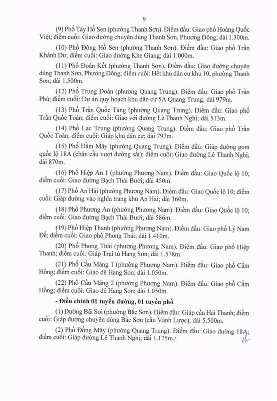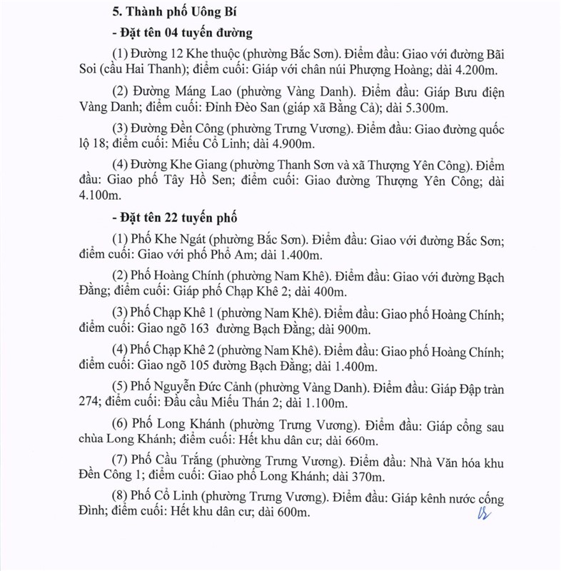 Đối với thành phố Uông Bí: đặt tên 04 tuyến đường, 22 tuyến phố; điều chỉnh 01 tuyến đường, 01 tuyến phố như sau: