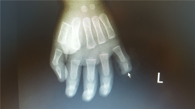 Hình ảnh phim chụp X.Quang bàn tay trái của bệnh nhi.