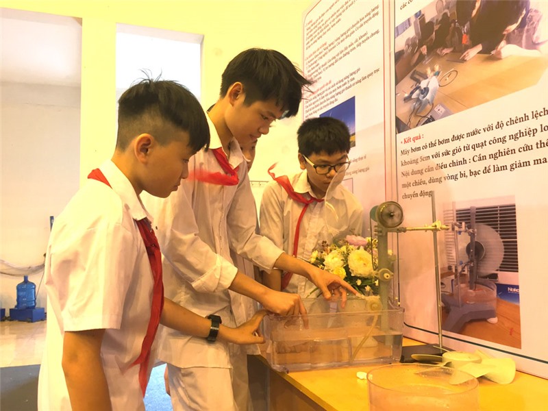 Các em học sinh Trường THCS Trưng Vương với mô hình máy bơm nước dùng sức gió.